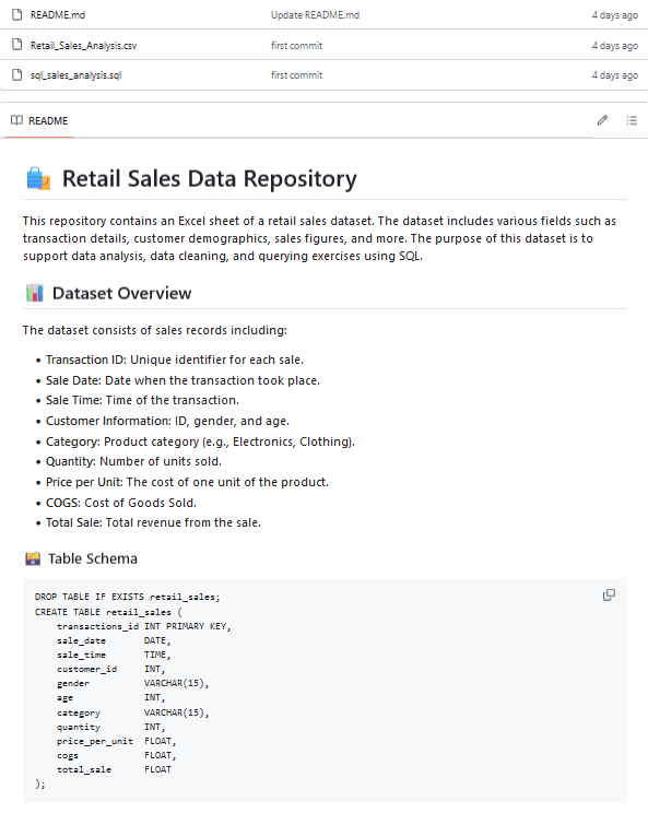 The Sales Analysis project on GitHub is a comprehensive resource for retail sales data analysis. It features a dataset containing various transaction details, customer demographics, and sales figures, which can be used for data cleaning and SQL querying exercises. The repository includes a schema for creating a retail sales table and several SQL query examples for data exploration, cleaning, and analysis, such as identifying total sales and best-selling months.
